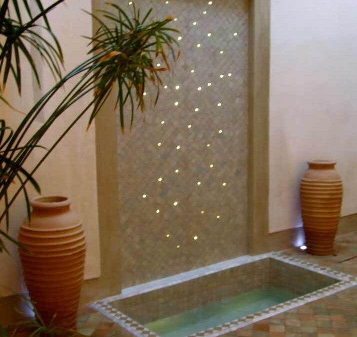 Dans ce patio d’une villa marocaine, cette fontaine apporte la douceur et la détente, par le chuintement discret d’un filet d’eau et l’effet reposant de la contemplation des étoiles…